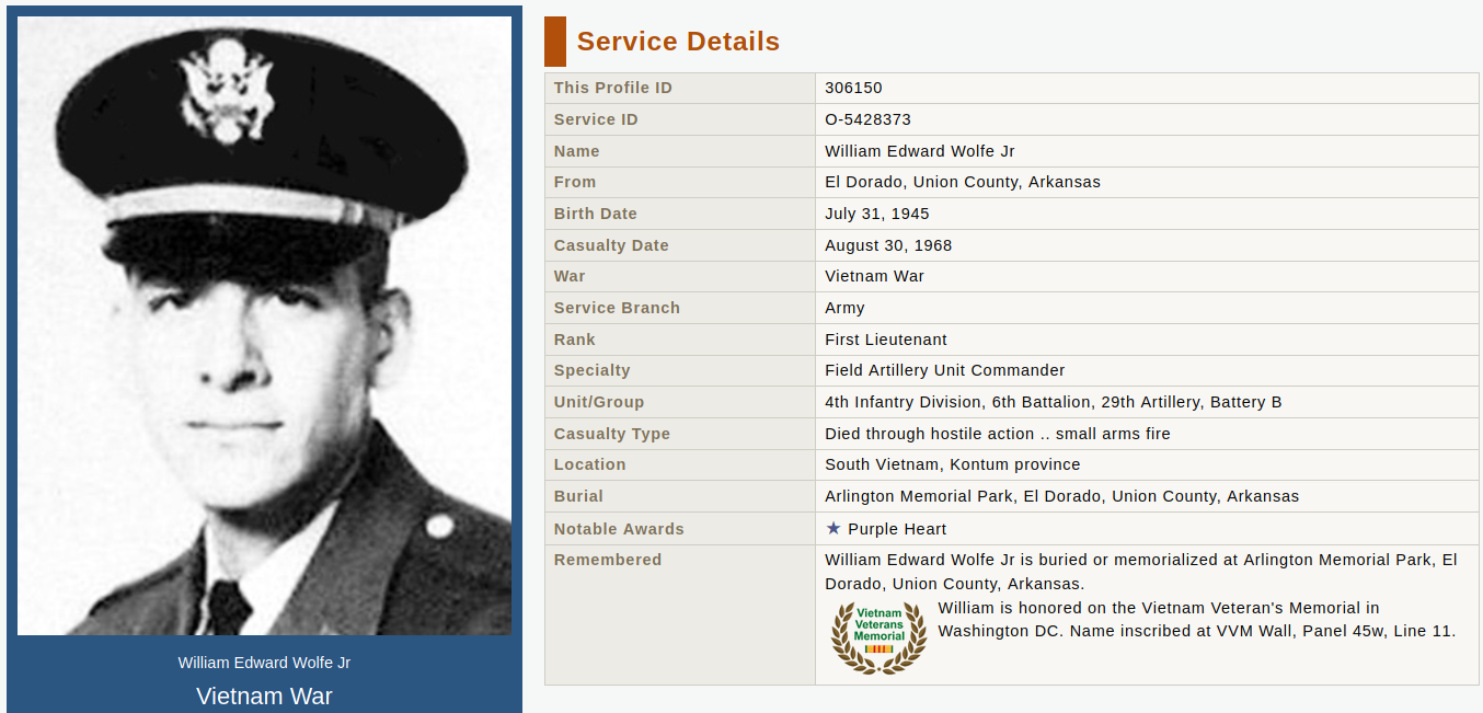 After I edited this photo, one of the men I served with told me this action took place on hill 1258. [Hill 1258 and 1338 are examples of numbers used to represent the hills we lived and/or fought on. The number is simply the number of meters tall the hill was.] Hills 1338 and 1258 were ones I had lived on before, but I didn't remember 1258 to be where this combat assault took place. Still... It was a lot of years ago. I have included a photo below of one of the men killed in this battle. I don't have a picture I or one of the men I served with took of William Wolfe; so, I got this one off the net. Lieutenant William Edward Wolfe Jr. was attached to our company as an artillery forward observer a few days after I came in country. [He arrived in the Nam a few days before me, but by the time he got assigned to artillery and then attached to our infantry unit, I was already in the field in Company C.] We quickly became friends. He knew really a lot about the M16-A1 and carried a shortened version he called a carbine. It didn't seem that common to have embedded artillery people with an infantry unit, so, I have wondered since our tour if William was also helping the military evaluate and improve the M16, as, after being attached to our unit, he could bear personal witness to their effectiveness in a combat unit. My friend William was in country just 1 month and 25 days before he was Killed In Action by small arms fire on Aug. 30, 1968, on this Hill 1258.